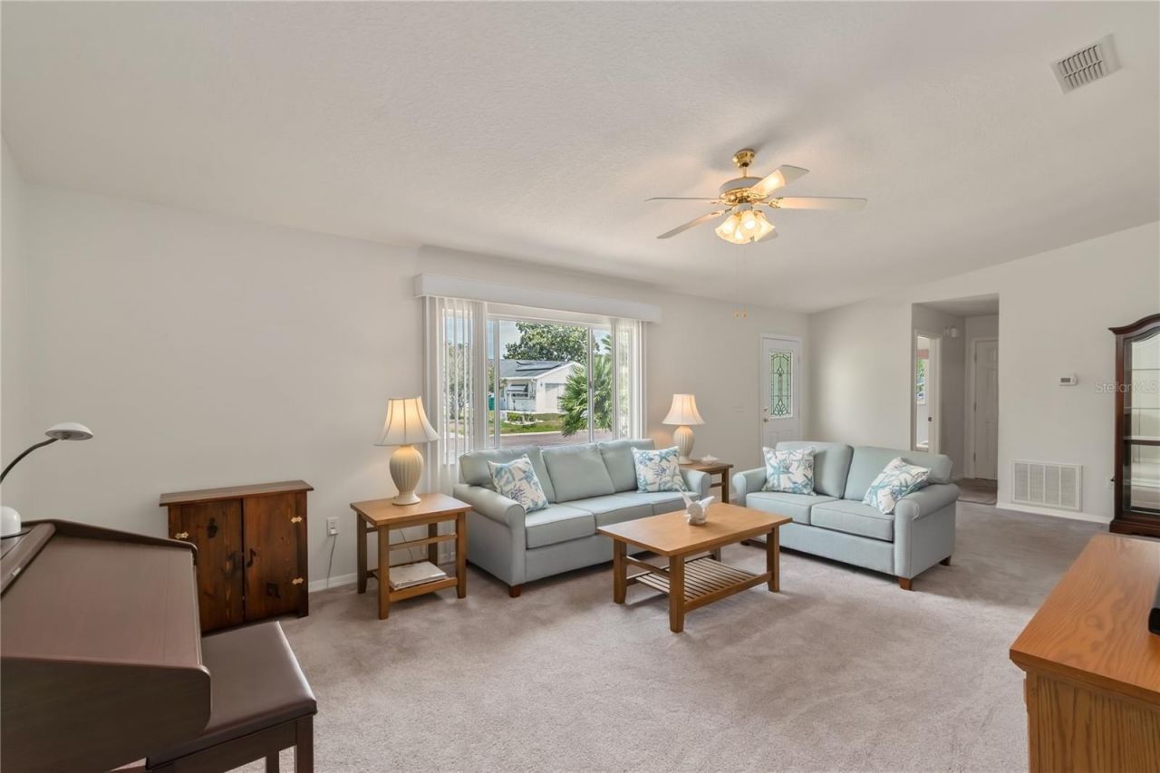 Welcome to this beautifully maintained home in the desirable Spruce Creek South 55+ gated golf course community, conveniently located just 2 miles north of The Villages! This EXPANDED PALM MODEL offers exceptional space and comfort, complete with an oversized garage for extra storage or workspace, along with a charming paver driveway and walkway that enhance the home's curb appeal. Step inside to find freshly painted interiors, soaring vaulted ceilings, and a bright, open living and dining room combination-perfect for both everyday living and entertaining. The spacious layout and generously sized rooms create a comfortable and inviting atmosphere throughout. The kitchen is a true highlight, featuring abundant cabinetry, GRANITE countertops, and plenty of prep space to make cooking and hosting a breeze. Enjoy year-round relaxation in the fully enclosed 23x9 Florida room, which flows seamlessly into a versatile 14x9 BONUS space-ideal for a home office, craft room, or hobby area. Step outside to the 10x15 screened lanai, the perfect spot to unwind with your morning coffee or enjoy Florida evenings. This home is ideally located near the community center and offers access to an array of amenities, including a pool, pickleball courts, fitness center, dancing and exercise classes, social events, billiards, and a library. Plus, enjoy the convenience of golf cart access to nearby shopping, dining, medical offices, and more. For added peace of mind, the roof was replaced in 2024, and the HVAC system was installed in 2014. Don't miss your opportunity to enjoy the active Florida lifestyle-schedule your private showing today!